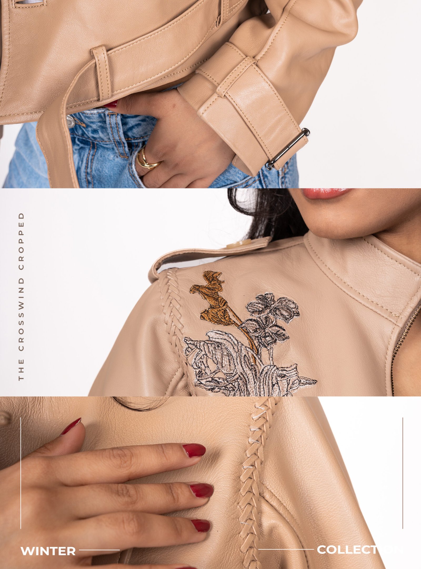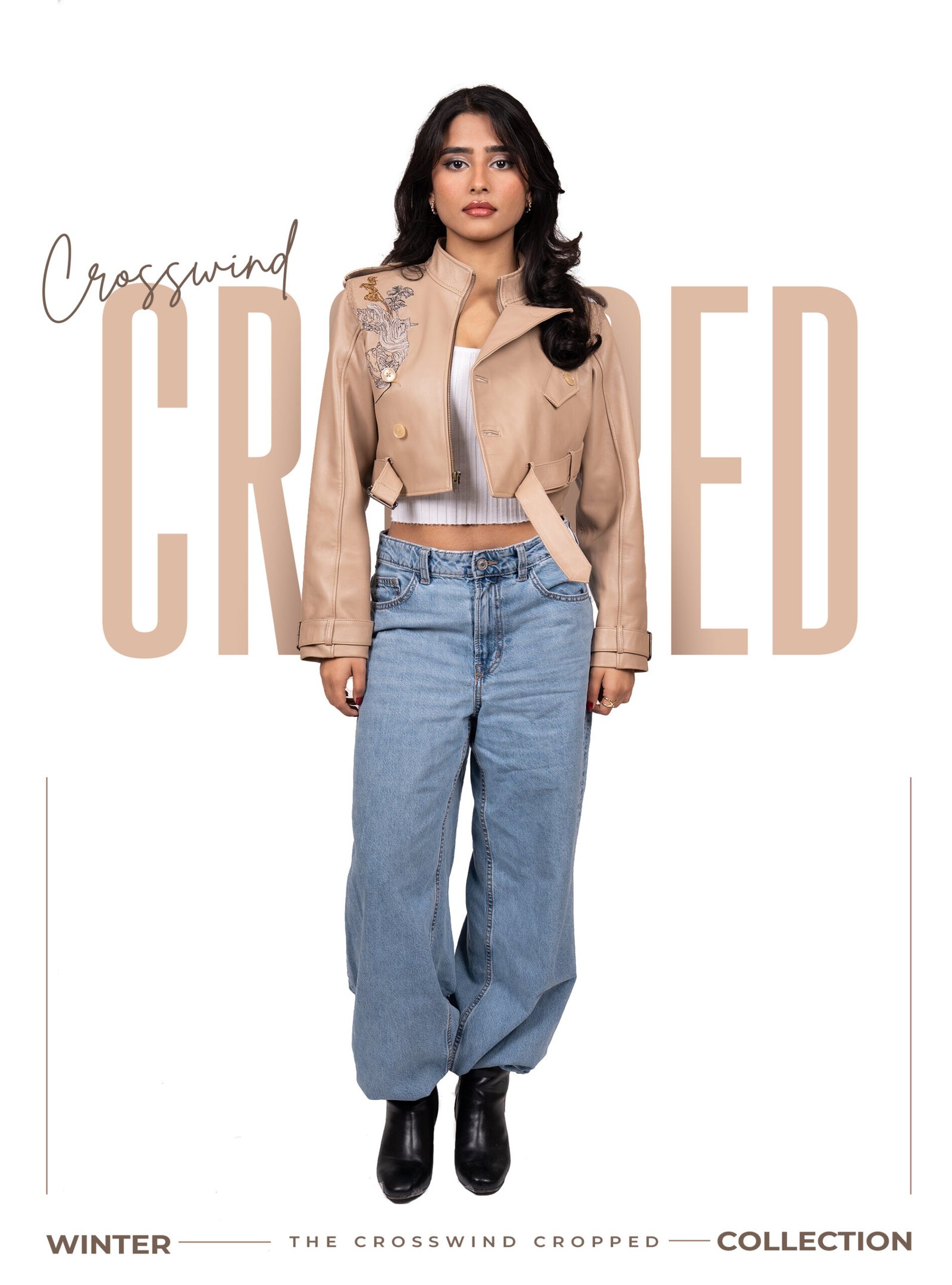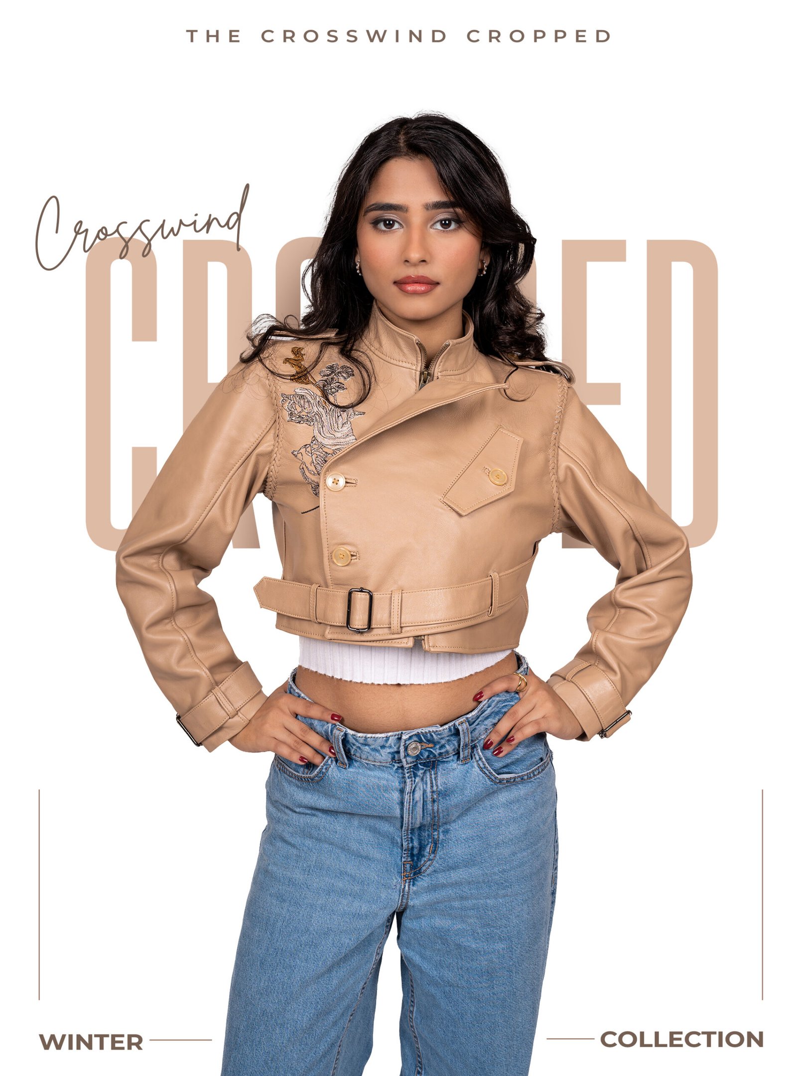 Inspired by shifting terrains, this cropped jacket balances military precision with modern femininity.